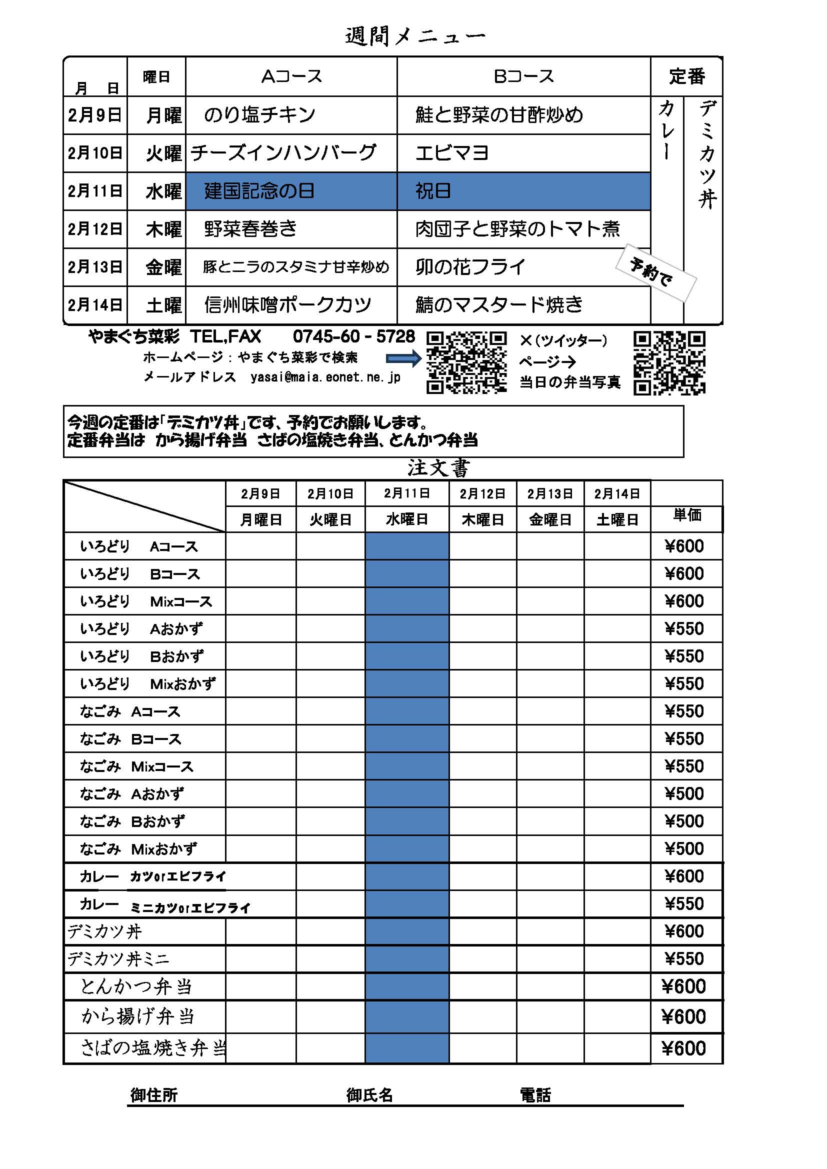 2月 9日~2月 14日の メニュー FAX番号 0745-60-5728